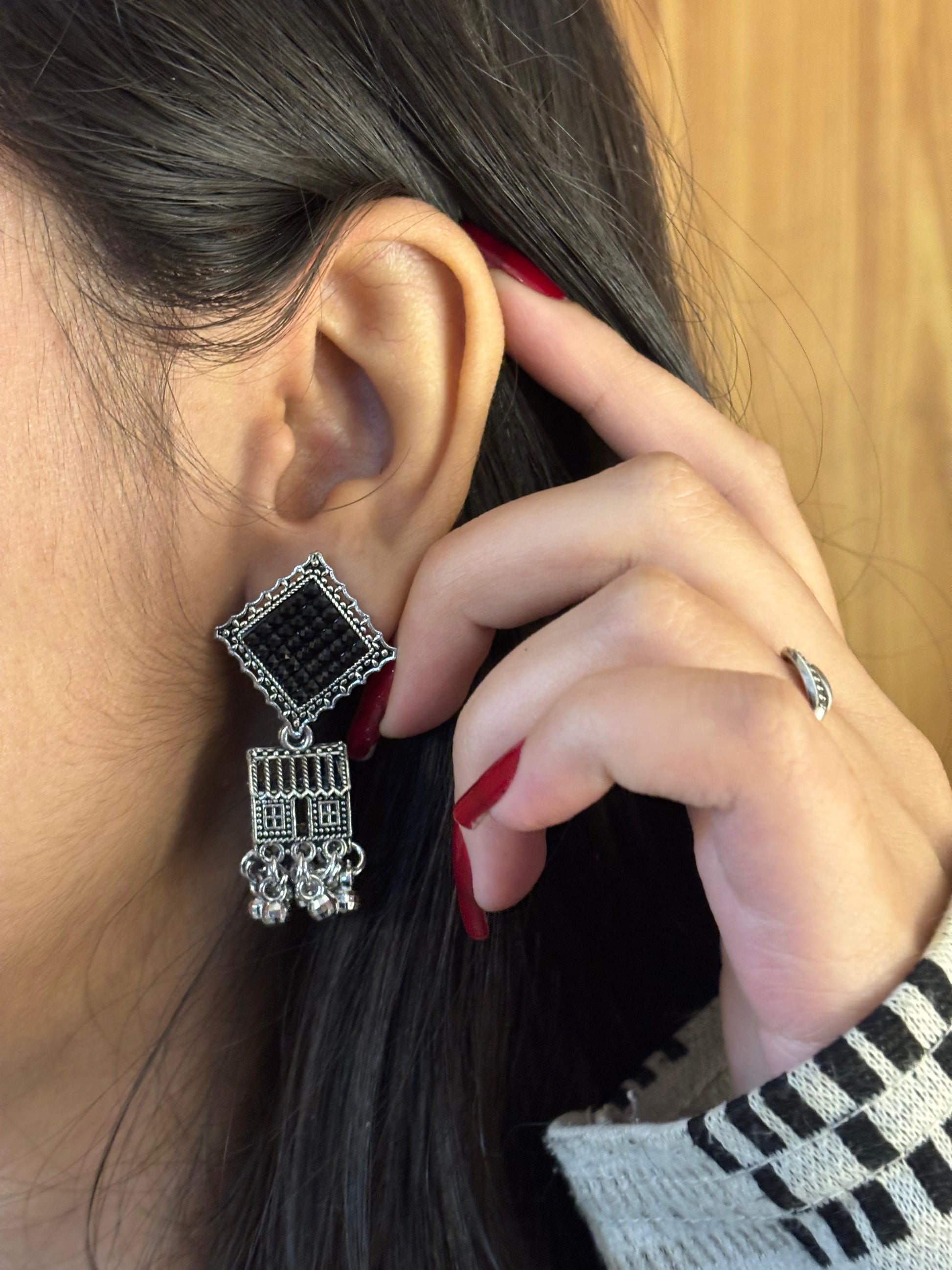 - Oxidised square jhumka earrings β Square oxidised stud with layered dangling bead elements.